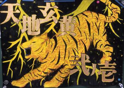 5月22日(水)の朝に各教室を巡回していたら、黒板に完成したクラス旗が飾ってありました。