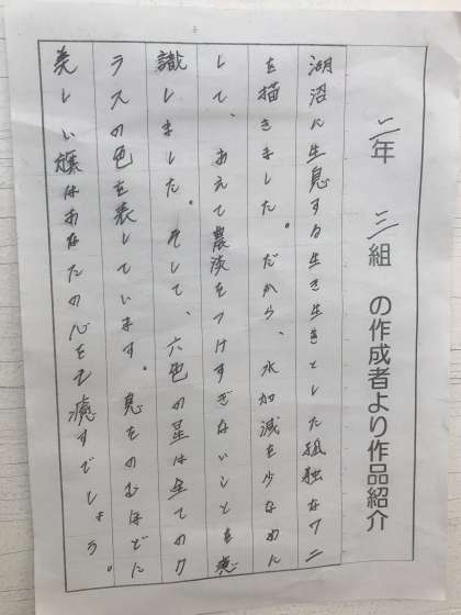クラス旗の作者より作品紹介 2−3 公開日 2024/05/24 更新日 2024/05/24 お知らせ 5月24日(金)、2階の渡り廊下に全クラスのクラス旗が展示されていました。 クラス旗の隣には、作者より作品紹介がありました。 クラス旗は、クラス旗作りの担当の生徒のみなさんが、放課後の時間を使って一生懸命に作り上げました! 心のこもったクラス旗は、各クラスの宝物です。