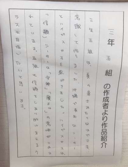 クラス旗の作者より作品紹介 3−5 公開日 2024/05/24 更新日 2024/05/24 お知らせ 5月24日(金)、2階の渡り廊下に全クラスのクラス旗が展示されていました。 クラス旗の隣には、作者より作品紹介がありました。 クラス旗は、クラス旗作りの担当の生徒のみなさんが、放課後の時間を使って一生懸命に作り上げました! 心のこもったクラス旗は、クラスの宝物です。