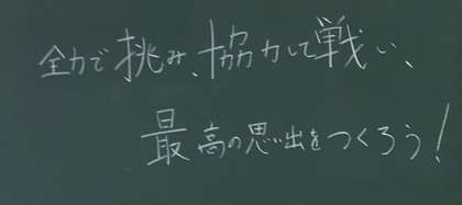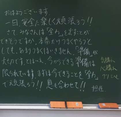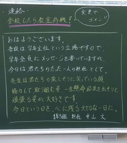 5月25日(土)の朝に校内を巡回していたら、各教室の黒板に学級担任の先生からのメッセージが書いてありました。