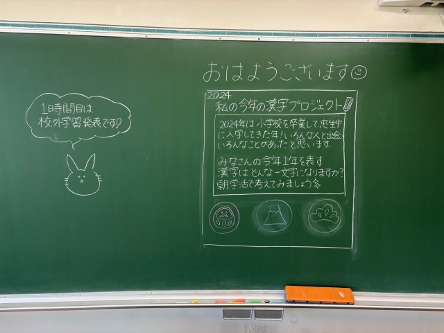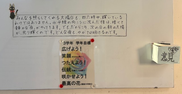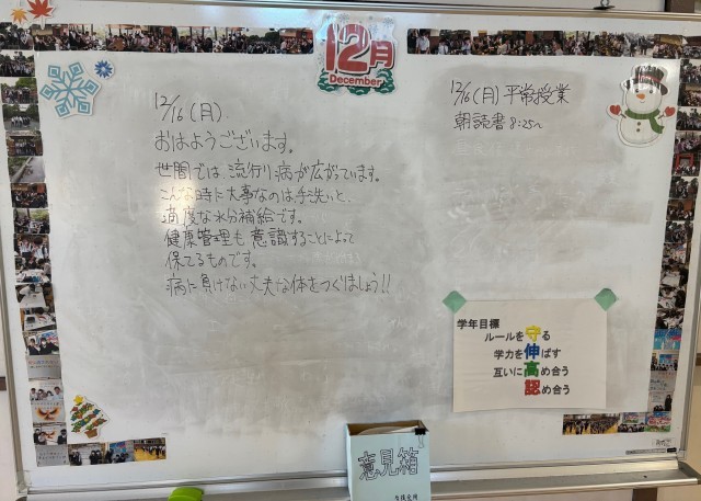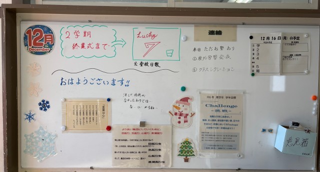 12月16日(月)の朝に校舎内を巡回していたら、学年主任や学級担任の先生からメッセージが書いてありました。