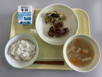 6月26日(木)の給食 公開日 2025/06/26 更新日 2025/06/26 今日の給食 今日の給食のメニューは、ごはん、牛乳、ますフライ、柚子ドレッシングサラダ、ひよこ豆のたまごスープです。ますフライとひよこ豆のたまごスープがとても美味しかったです。ご馳走様でした。