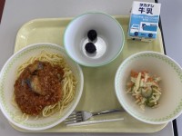 今日のメニューは、町田産なす入りミートソーススパゲティ、シャキシャキポテトサラダ...