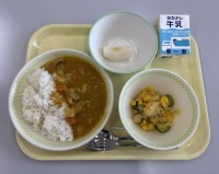 今日の給食のメニューは、麦ごはん、牛乳、カレー肉じゃが、ちくわの磯辺揚げ、野菜の...