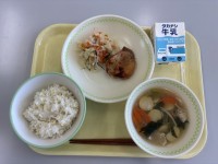 今日の給食のメニューは、きび入りごはん、牛乳、鶏肉のしょうが焼き、浅漬け、お月見...