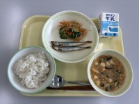 今日の給食のメニューは、ごはん、牛乳、ピリ辛麻婆豆腐、焼きシシャモ、バンサンスー...