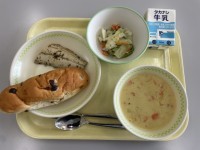 今日の給食のメニューは、チキンライス、牛乳、ポテトとベーコンのクリームスープ、野...
