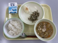 今日の給食のメニューは、高野豆腐のそぼろごはん、牛乳、いかのさらさ揚げ、磯香和え...