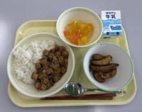 今日の給食のメニューは、きび入りごはん、牛乳、鶏肉のしょうが焼き、浅漬け、お月見...