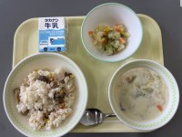今日の給食のメニューは、チキンライス、牛乳、ポテトとベーコンのクリームスープ、野...