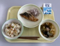 今日の給食のメニューは、黒米ごはん、牛乳、焼きさばのおろしソースかけ、野菜のごま...