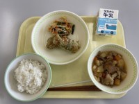 今日のメニューは、ごはん、油麩入り肉じゃが、ちくわの磯辺揚げ、町田産白菜のからし...