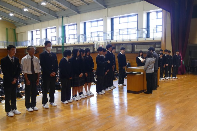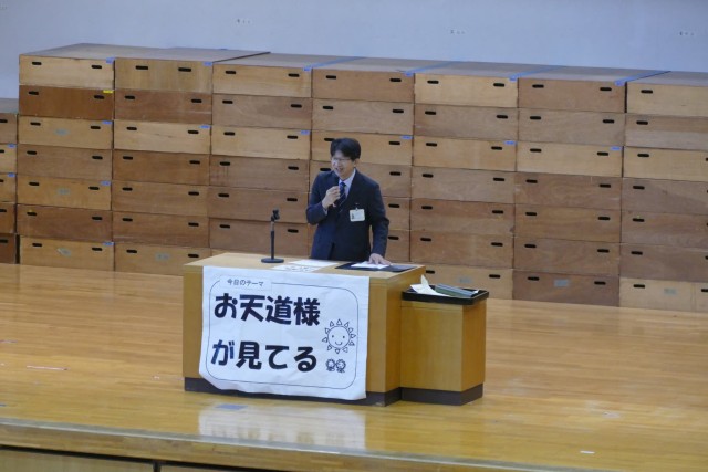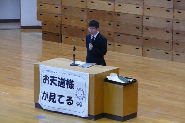 12月8日(月)8時25分からアリーナで全校朝礼を行いました。はじめに校長先生から、「お天道様が見てる!」というお話がありました。次に、生活指導主任の小川先生から、不審者情報や自分の身を守るお話があり...