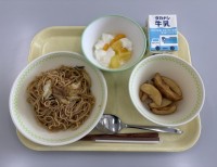 今日の給食のメニューは、ソース焼きそば、牛乳、ガーリックポテト、フルーツ杏仁豆腐です。ソース焼きそばとフルーツ杏仁豆腐がとても美味しかったです。ご馳走さまでした。