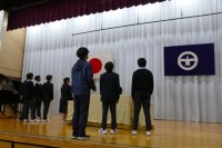 2年生のみなさんがステージの準備をしています。国旗や市旗を運んできれいに設置しています。演台もみんなで協力して所定の位置に設置しました。2年生もとてもチームワークよく働いています。素晴らしいです。