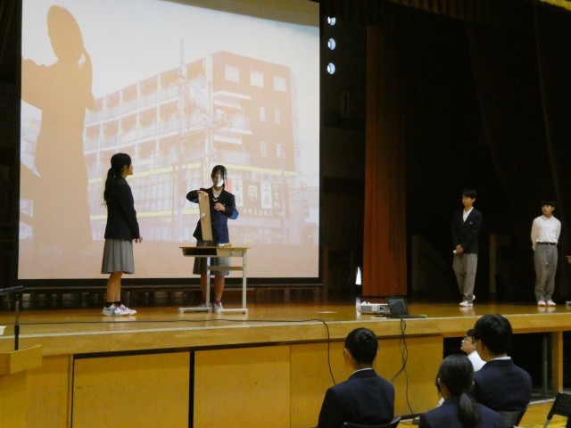 12月17日(水)に1年生が職業人の話を聞く会の事後学習として発表したスタンツのクラス代表が体育館にて生徒や保護者の前で発表してくれました。