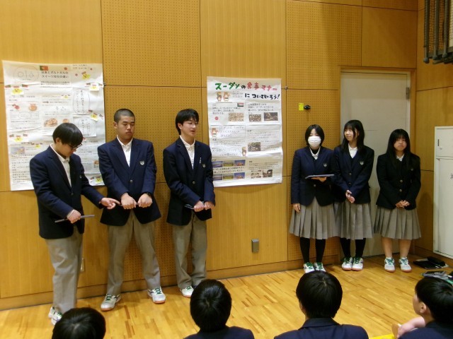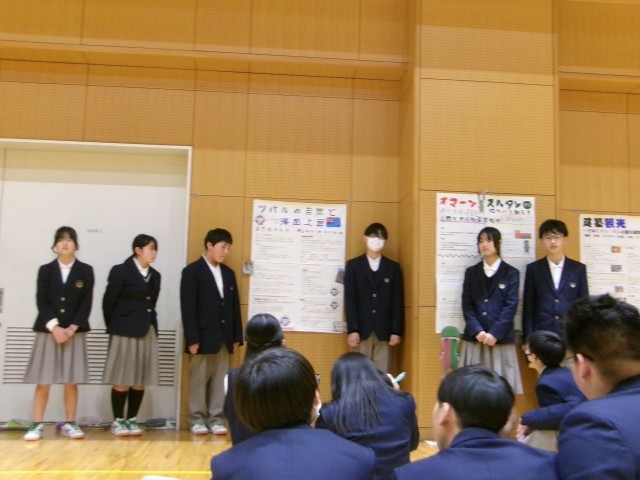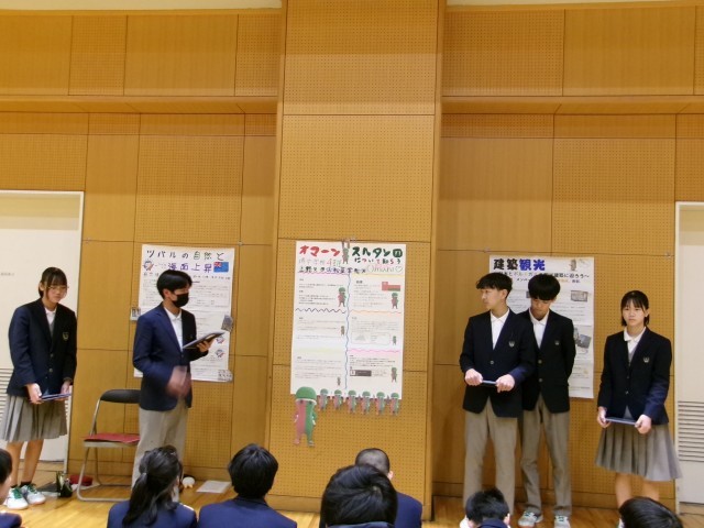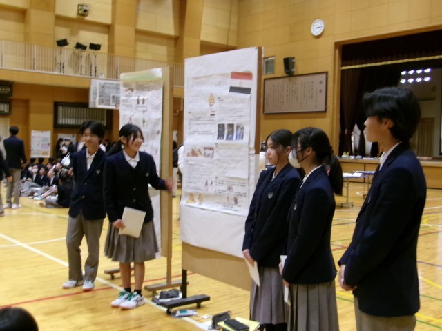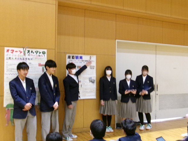 2学期から事前学習を行い、12月当日の大使館訪問や見学地訪問を経て、発表会を迎えました。生徒は緊張した面持ちでしたが、堂々と発表する事ができました。また、他のグループの発表も興味深く聞いていました。
