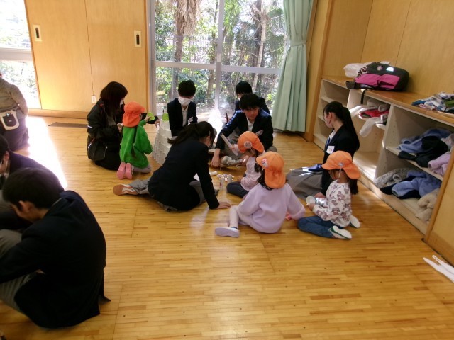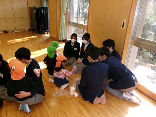 家庭科で園児のためにおもちゃ制作を行い、実際に遊んでもらいました。