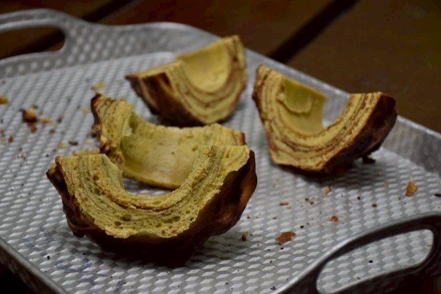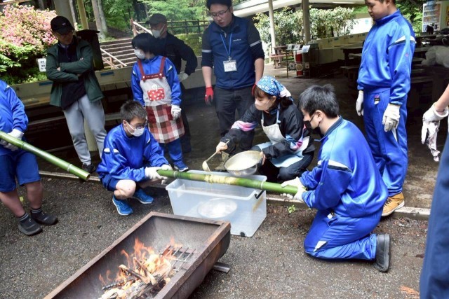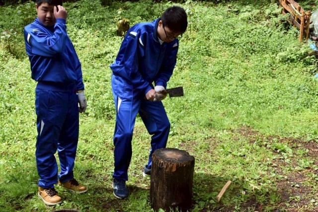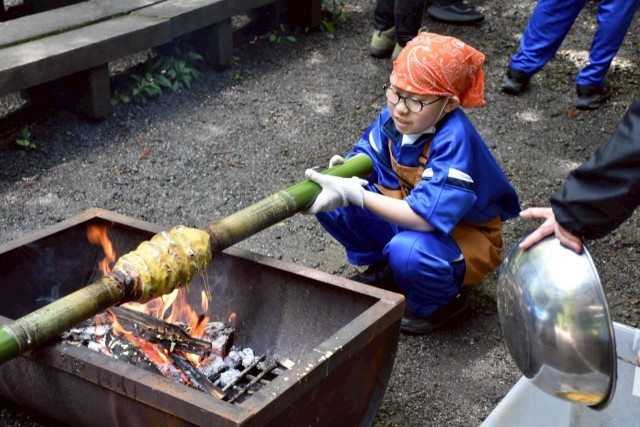 最初にバウムクーヘン作りを体験しました。ただ焼くだけでなく、薪や竹の準備も自分たちで行いました。焼き上がるのにたくさんの時間と労力がかかりましたが、とてもおいしいバウムクーヘンができました。