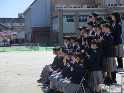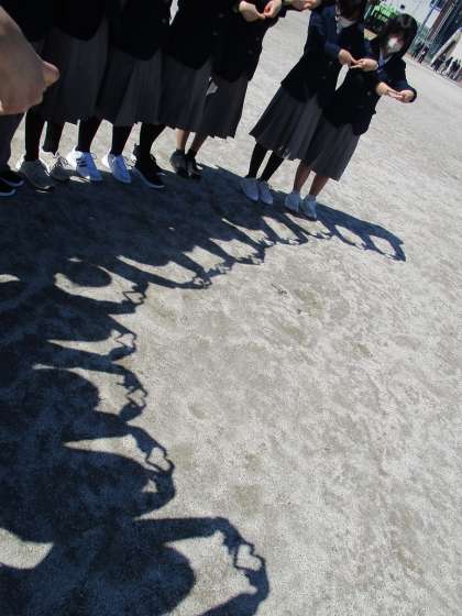 1枚目は笑顔でポーズなし、2枚目はクラスでポーズを決めて撮影しました。とても天気が良く、校庭でポーズを考えていると、影がとても素敵に映っていました。