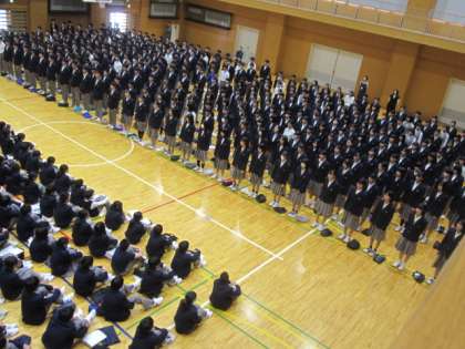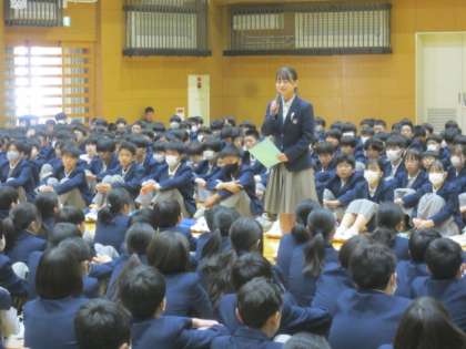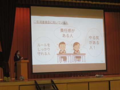 2,3年生の歓迎の歌「明日の空へ」から始まり、生徒会や委員会の活動内容を3年生が説明をしました。1年生は明日委員会を決める予定です。やってみたい委員会は見つかりましたか?