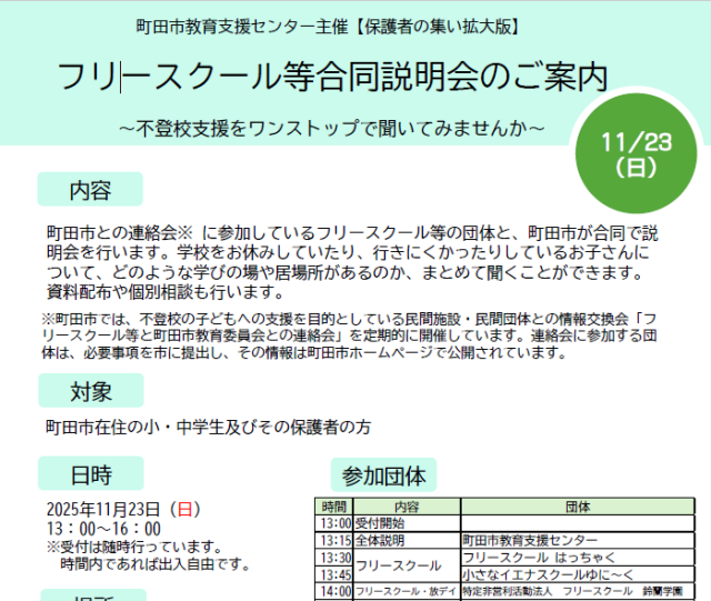 【受付終了しました】町田市教支援センター主催【保護者の集い拡大版】フリースクール等合同説明会のご案内